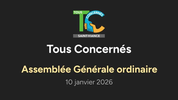 L’assemblée générale ordinaire de l’association Tous Concernés s’est tenue le 10 janvier 2026 à 10h30. Elle avait pour objectif de dresser le bilan de l’année 2025 et de présenter les orientations pour l’année 2026. La réunion s’est déroulée en présence des adhérents, de leurs proches, de représentants de la commune de Saint-Viance, de partenaires associatifs et d’intervenants impliqués dans les actions menées par l’association.